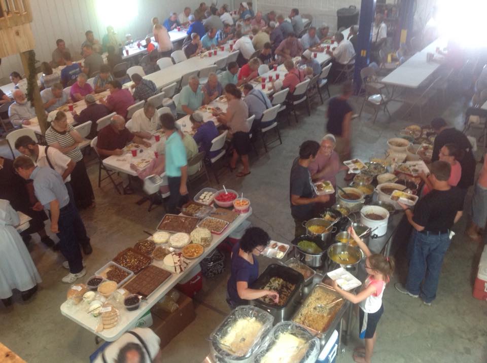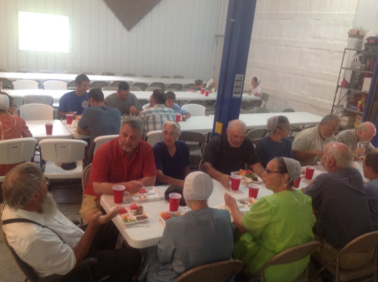 The chairs and tables were all set up in David’s shop, where we had feasted the night before. And the women soon began laying out the food. Grilled chicken, prepared by Marcus Marner and his wife, Joanne. And everyone who came would bring a dish of some food or other, David told us. That’s the rule of the Yoder Reunion. You bring food with you. And we were all pretty much set. And around 3:00 or so, the first people began to come.