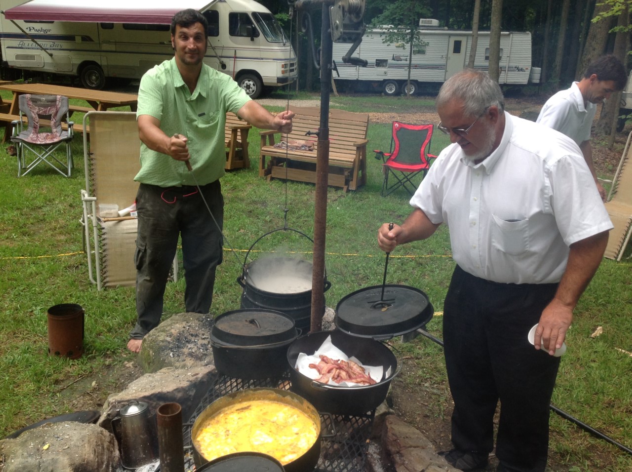 Saturday morning. The big day. The Reunion meal was scheduled for that afternoon at 4:30. This morning, there would be a big campfire breakfast. By 8:30 or so, we were sitting around the fire, sipping coffee. My nephew Andrew stood over the fire, tending to many pots and pans and a vast kettle hanging from an iron pole. I poked around, all interested. The vast kettle was filled with gravy, and Andrew kept stirring it vigorously. And then soon, he uncovered three or four flats of eggs. He cracked dozens of eggs into a big cast iron pan, and set it on a grate over the fire. Things were stirring, and things were looking good. Smelling real good, too.