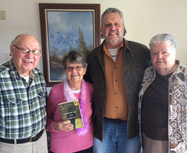The day dawned cold and windy. I always like to sleep in a bit on Saturdays. And I did that morning. Got up, and cleaned up and ran some errands and got my coffee at Sheetz. Haven’t seen anything of the greasy little weasel man lately. Maybe he’s still coming around and butting in line when I’m not there. Back then, to my house for a bit. Right at 9:45, Ken and Rosita arrived. I walked out with my messenger bag and got into Amish Black and followed them over back roads to where Elizabeth and her husband lived. I stuffed a few books into my bag when we got there. I knew she had a copy of my book, but I’ve learned to drag a few of those with me into any kind of meeting like this. Rosita had told me. Elizabeth had asked if it was OK if her sister would come, too, to meet me. Of course, I said. We parked and walked into the very nice apartment building that made up this wing of the retirement center. Rosita seemed to know where she was going. I followed her and Ken onto the elevator and up to the floor where Elizabeth lived. Through a long hallway, then to the right number. Rosita knocked. The door opened.