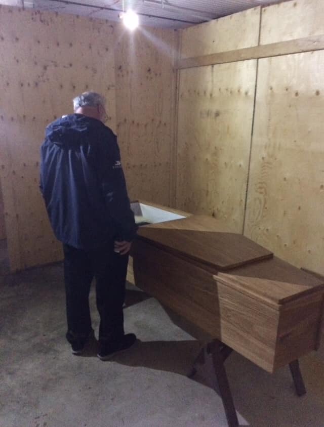 Thursday. First, there was a meeting with the undertakers at 8:30. I’ve never had much to do with funeral homes or undertakers. I drove Amish Black east on Rt. 3 to Aylmer, followed by Alvin and Naomi in Alvin’s big Dodge truck. I pulled in at the Tim Horton’s there on the west edge of town. The drive-up window was deserted, oddly, so I pulled through and ordered a large coffee, black. It was thin and weak. I was disappointed in TH. I thought you guys had decent brew. Naomi got out of the truck and I cleaned off the passenger’s seat in my Jeep. We drove through town, to the east side of the main traffic light. And there, on the left, right at the end of the row of storefronts. There it stood. Kebbel’s Funeral Home. It’s kind of tight, getting in and out of the place. I pulled in, drove around the back, and parked on the east side right up front outside the doors. We won’t be long, I told Naomi. We walked in. The large front room was empty. A bell must have rung in the back. The son of the father/son team stepped out and walked to greet us. Bob, he’d told me the night before, when he was picking up Dad’s body. He was very calm and smooth and efficient.