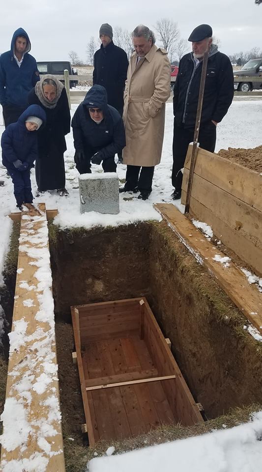 We milled around then as the body was placed in a hearse buggy and the procession slowly drove out to the road and headed west. I got in my Jeep and drove south around the block. Then up the main drag west, then back north to the graveyard. I was among the first vehicles to get there. I parked Amish Black directly across the road. Just a bit back from even with the gate. And there I sat. It was bitterly, bitterly cold outside. I dug into a pile on the back seat and found a big thick stocking cap. I would take that with me, in case my head got too cold. Other vehicles flowed in then from both directions and parked all around on the side of the road. Huddled in my trench coat, I walked out to the grave and stood there with a few of my brothers and nephews. The hole had been covered overnight, to protect it from the snow. The men lifted the plywood and the planks and set them aside. We stood, looking down at the rough wooden box that would hold the coffin.