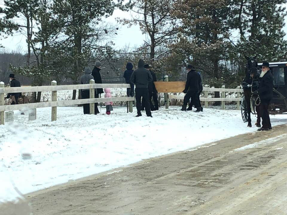 And way up north, around the corner, came snaking a long, slow line of buggies. The lead buggy got there eventually, and they pulled off to the side a little, just outside the gate. The buggy stopped. Some men emerged. One held the horse. The pallbearers came and opened the rear door. They pulled out the coffin. Timothy Stoll, the funeral director, took the two sawhorses from the buggy and led the pallbearers into the yard. There, about halfway across, they stopped and set it up. There would be one last quick viewing in the bitter December cold.