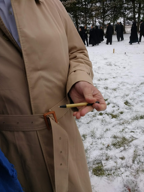 The coffin was set up and people filed through one more time. The last time. They walked by on both sides, so it didn’t take long. And here, I’ll say this. Pretty much everything that happened to me on this trip was unplanned. You can’t plan events or control them. You just walk. I was sitting in my Jeep across the road, staying warm and watching things. Watching people file past and gathering over on the left by the gaping hole in the ground. About then, my nephew, Titus Aden Yutzy, came strolling by. Rachel and Lester’s second son. A talented auctioneer, he is in high demand in his home area. A good auctioneer is like a good preacher. It’s easy to listen to either one. Titus had flown in late the night before, because there was a wedding back in Kansas in his wife’s family. As soon as he could get away, he hopped a plane to Detroit and drove over. He was determined to see Grandpa Wagler one more time. I rolled down my window as he walked up. We chatted. And he kind of grinned at me. “Are you going to put a pen in Grandpa’s hand?” He asked. I just looked at him. It didn’t register for a second, what he was saying. A pen? In Dad’s hand? And it hit me. Yes. What a grand idea. A pen. The writer would be buried, holding a pen. Dad’s older sisters would be pleased that it wasn’t a mini typewriter, or something scandalous like that.