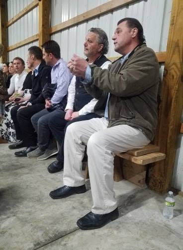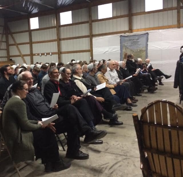 Supper was served at 4:30. My nephew, Reuben Wagler, stood and announced the evening meal. Everyone was welcome to stay and eat. We bowed our heads as he returned thanks for the food, and for the life that his father had lived. We all meandered over to the gym, then, just across the parking lot. I was hungry for my One Meal. Supper was hot dogs and some side dishes. And cake for dessert. All the food was good, all the way through. The May’s Lick Amish community stood tall, when it came to feeding the throngs of people that showed up. That night’s offering was the simplest. The next night, there were casseroles and meat loaf and cake and ice cream. Real meat, they served it by the truckload, almost. I was certainly happy to be fed by such hosts. After supper, the evening wore on. Until around seven or so. My brother-in-law, Joe Gascho, Rosemary’s husband, stood for a short devotion and to read an evening prayer. Joe has been a preacher man for decades, up there in Aylmer. He spoke clearly, so that all could hear him in the large warehouse.