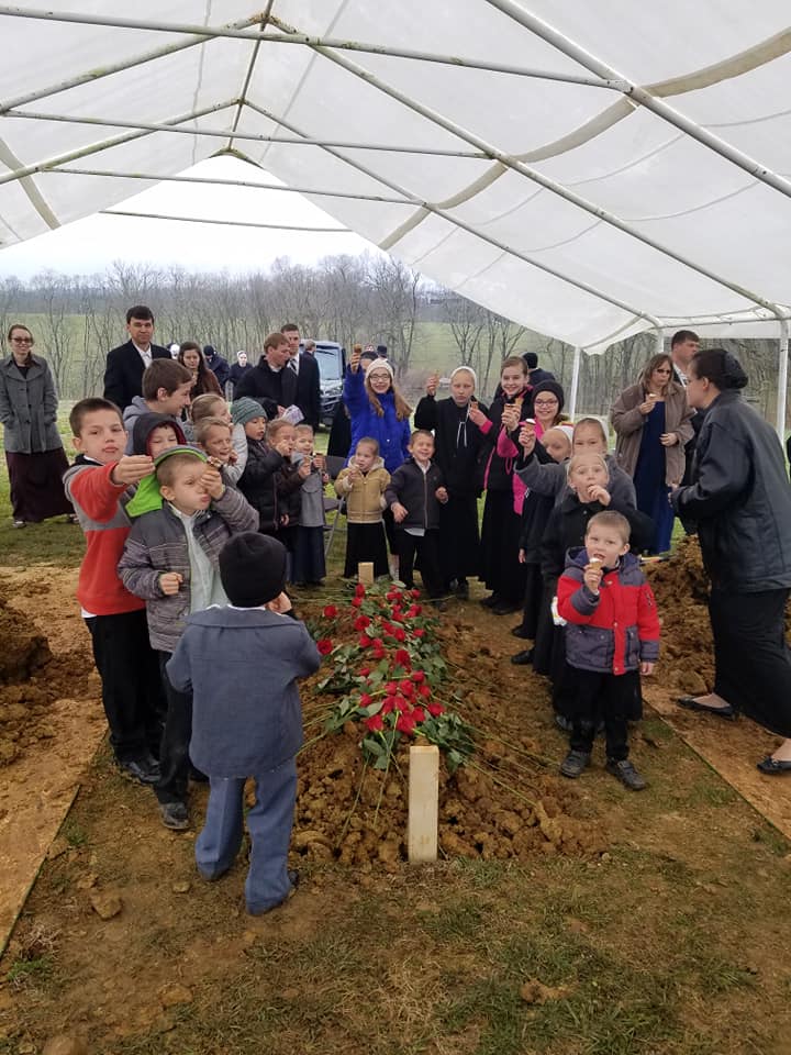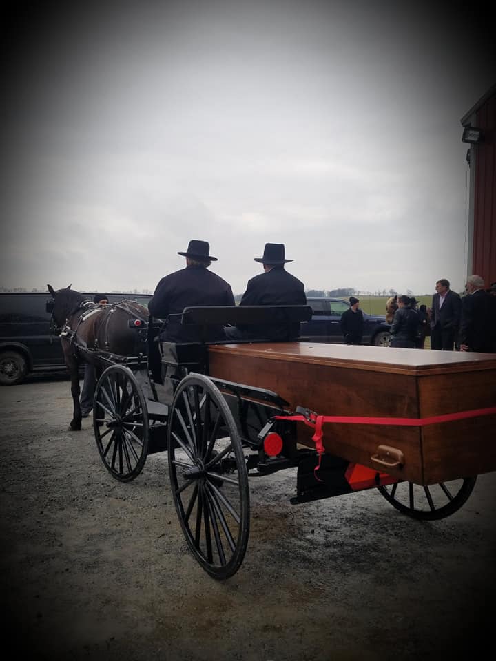 Joseph’s six sons carried him outside and set the box onto an open hack buggy parked there. The box was strapped in, and the buggies lined up. Nathan joined me in my Jeep as we edged into line. And the buggies slowly started out, and turned right onto the road. I was amazed to see two local cop cars waiting. One led the procession, and one brought up the rear, lights flashing. A mile or so down the winding road, then right onto a side road. The cop cars left us when we turned off the main road.