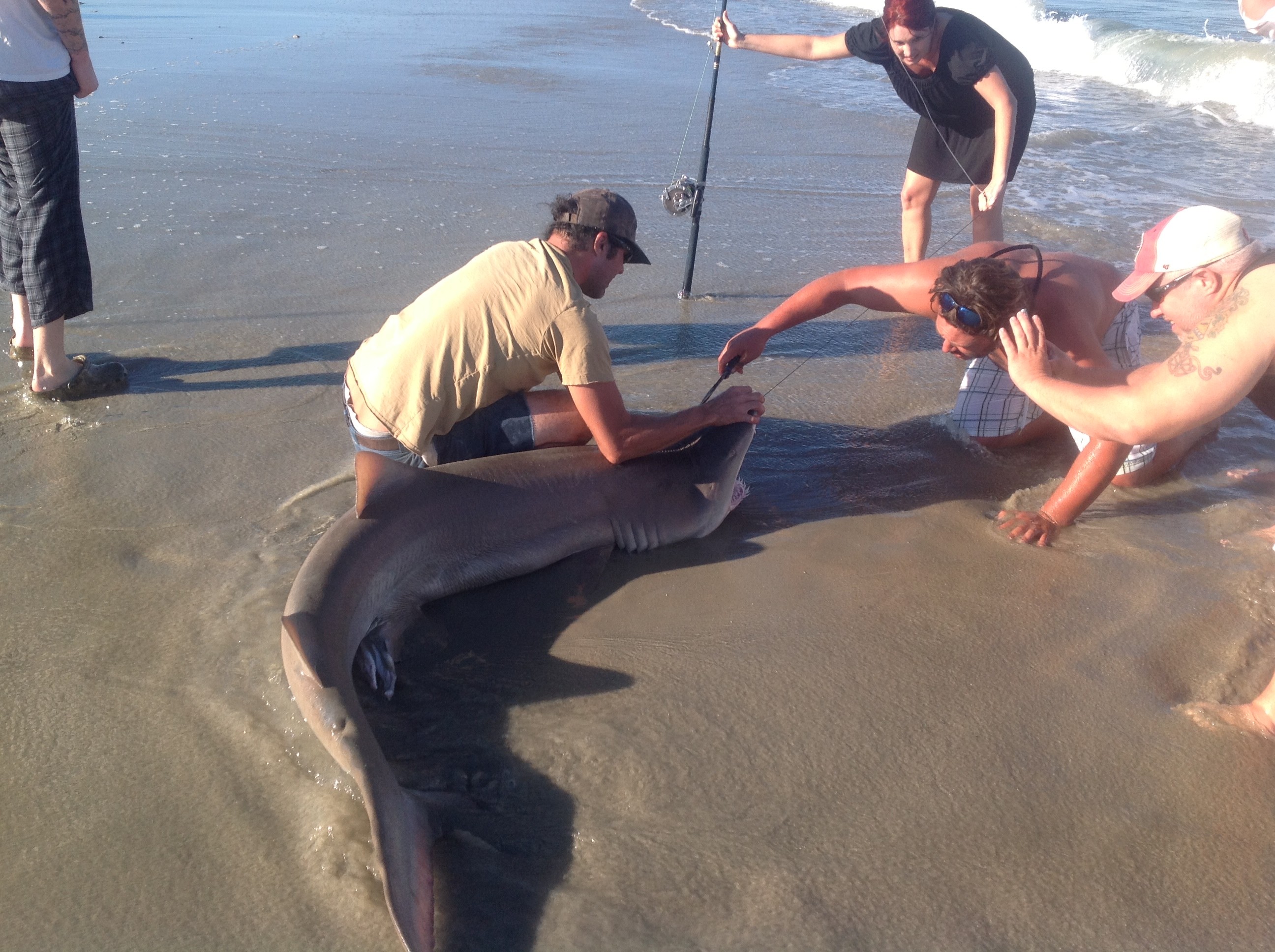 And late that morning, Brandon snagged another shark. These guys were for real, this year. I stood by and snapped pics with my iPad, as he fought the fish in. You watch the line, and it comes closer and closer to shore. And then you see the shadow of a log, out there in the water. The shark. Brandon expertly beached the fish. He and Steven swooped down and subdued the beast. Measured the length. This one was right at 74 inches. Just a tad over seven feet long. That’s a big thing, to pull out of the sea.